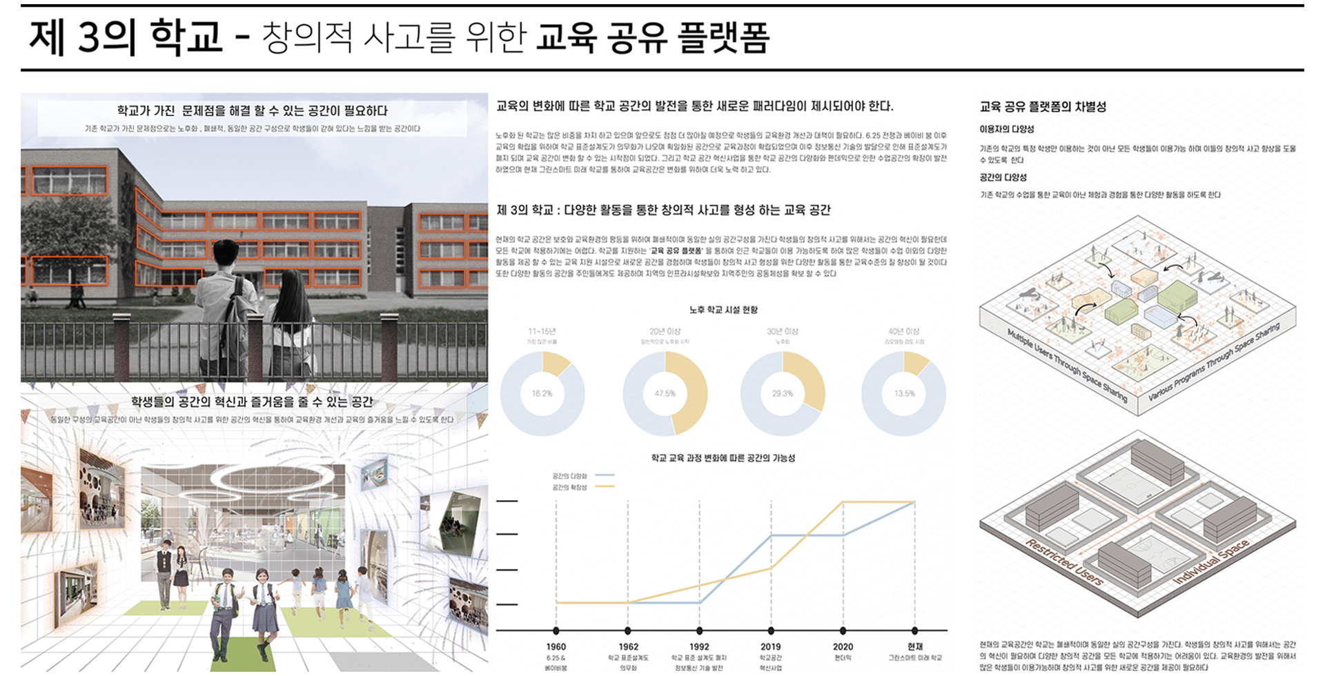 학교를 지원하는 새로운 교육 시설인 ‘교육 공유 플랫폼’은 인근 학교들이 이용하며 공간의 혁신을 통하여 학생들이 교과목 수업 외 다양한 교육을 제공하며 새로운 공간을 통한 활동으로 학생들의 창의적 사고형성과 다양한 활동 제공하며 이를 통해 교육수준이 향상되도록 하는 교육 지원 시설이다.