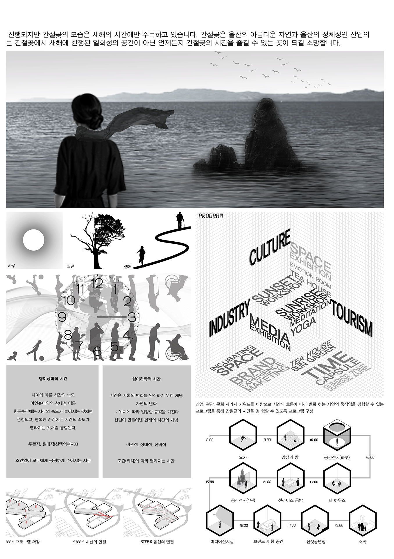 간절곶에는 1월1일 전국의 많은 사람들이 새해 소망을 품고 이 곳을 찾아옵니다. 송년제야행사와 해맞이 행사가 많은 인파 속에 진행되지만 간절곶의 모습은 새해의 시간에만 주목하고 있습니다. 간절곶은 울산의 아름다운 자연과 울산의 정체성인 산업의 많은 시간을 담고 있어 이 시간들을 통해 새로운 소망을 품을 수 있는 장소됩니다.